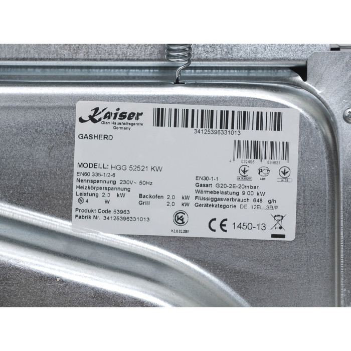 Плита газова Kaiser HGG 52521 KW Eco * Панель управління з ергономічним нахилом * механічний таймер «Минутник» з функцією СТОП Газова нагрівальна поверхня: * Нові газові пальники-зменшення витрати газу, €CO-Systemпідвищення ефективності нагріву, турбота про навколишнє середовище * запобігання від витоку газу в пальниках Газ-Контроль * Електропідпал конфорок в поворотних ручках управління * мала пальник, посилена пальник + 2 нормальні * чавунні решітки * скляна кришка Газова духова шафа з електрогрилем: * Збільшений обсяг * запобігання від витоку газу в духовій шафі Газ-Контроль * Електрозапалювання духової шафи в поворотній ручці управління * інфрачервоний електричний гриль * демонтована дверцята зі знімними стеклами (3 шт.) – холодний фронт • таблиця рецептів на внутрішній стороні дверцят • елегантна ручка дверцят з логотипом • самоочисна каталітична емаль духової шафи • хромовані бічні сходинки для дек • електричний обертовий рожен, рамка з виделкою зі знімною ручкою. • 2 емальованих дека з антипригарним покриттям AAB * Алюмінієвий лист • Універсальний скляний лист Kristall * Хромована багатофункціональна решітка * Легковыдвигающийся посудний ящик на роликах, зі скляним фронтом * Система висування ДЕК (опціонально) TeleskopЕлектричний обертовий гриль